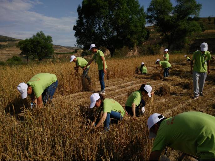 在金色的麦田里,志愿者们埋头苦干,挥汗如雨。