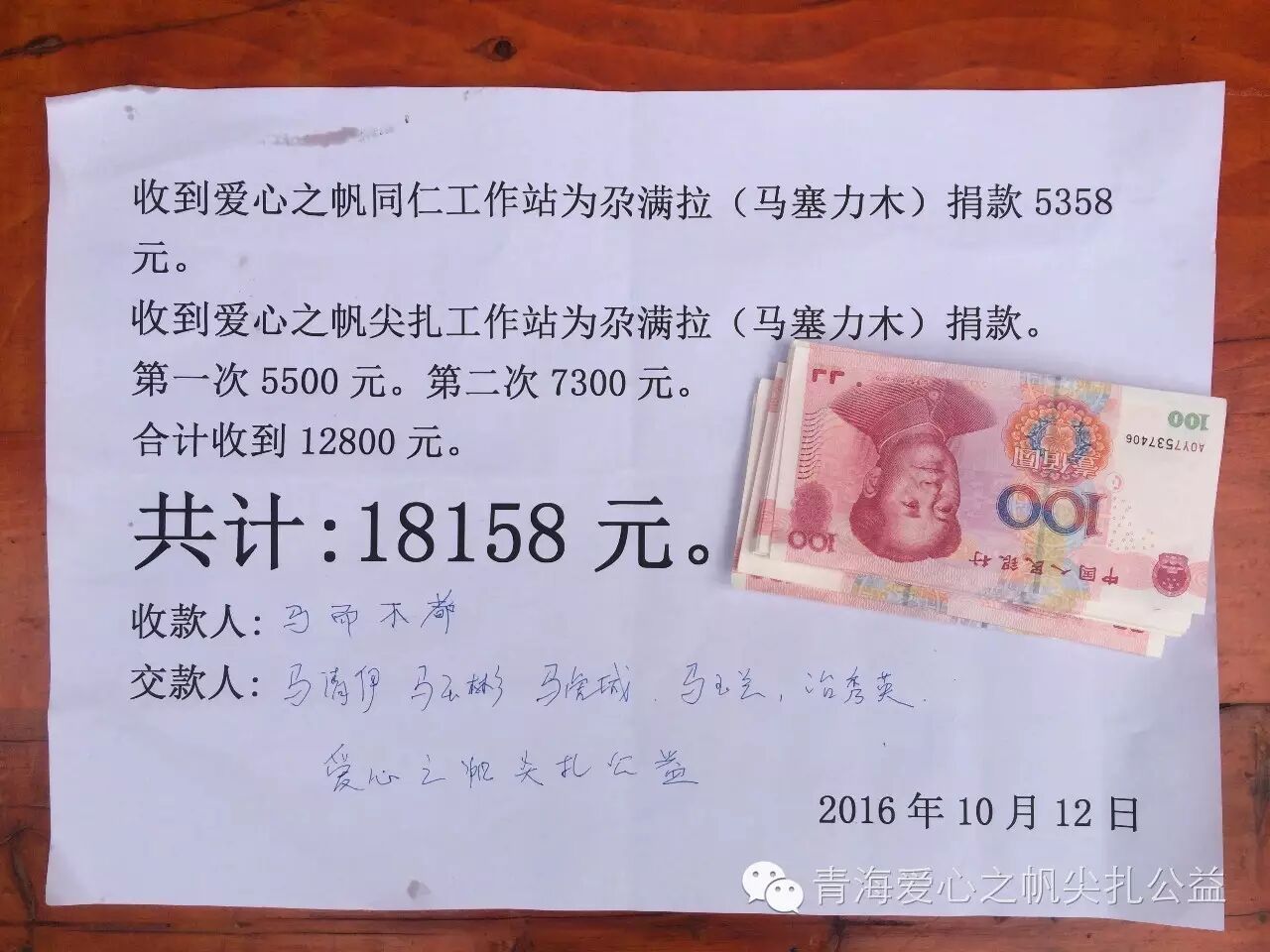 感赞真主!由爱心之帆尖扎公益和同仁工作站联合救助的尕满拉马赛力木经过两个多月的精心治疗病情已大为好转,10月12日最后一笔爱心款交到患者父亲手里,自此尕满拉马赛力木的救助活动正式结束。