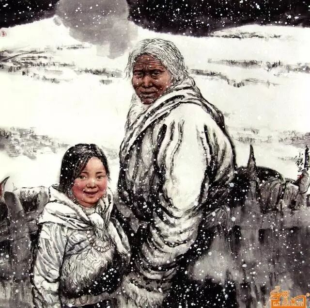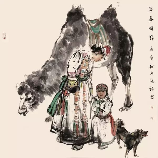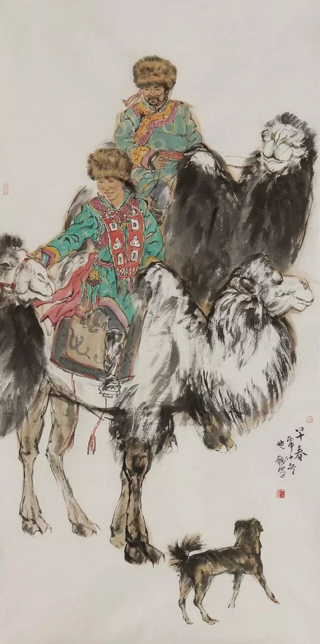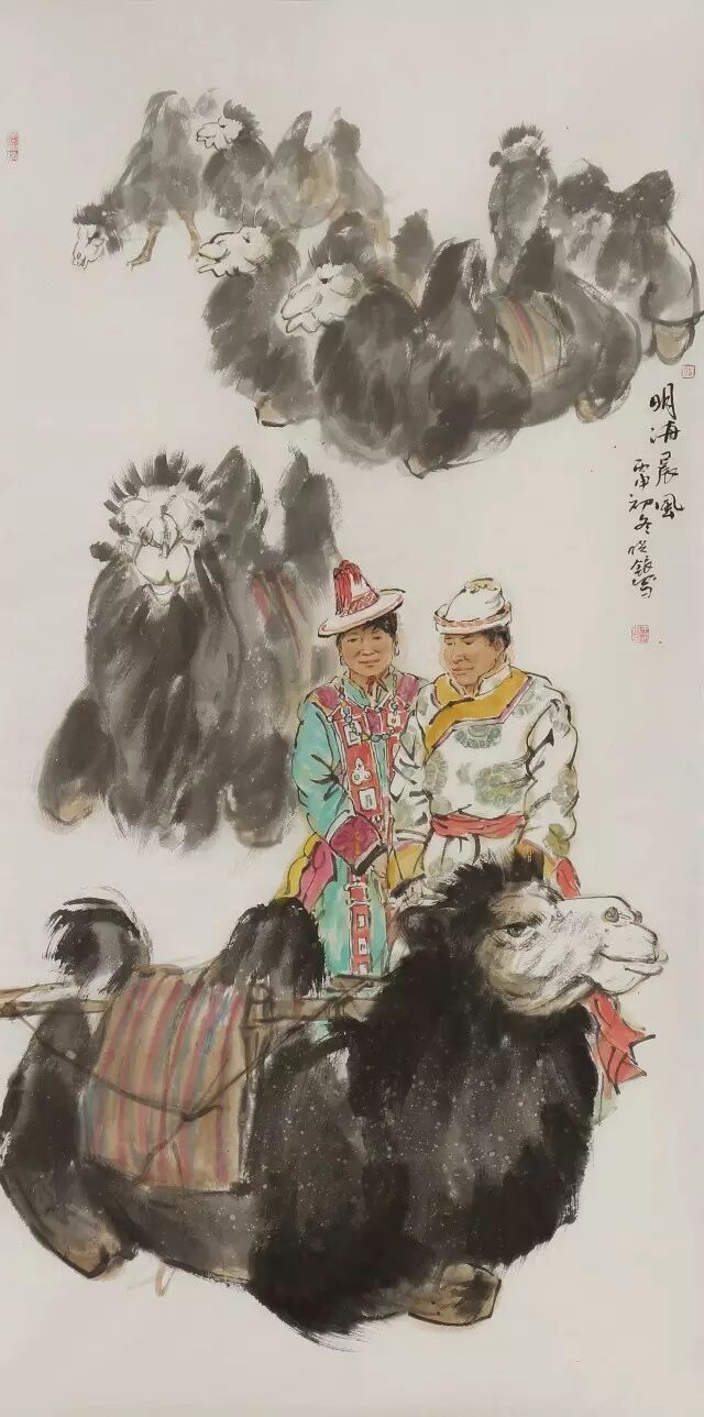 作为艺术家,他抱着最坦诚的愿望悄悄的关注和祝福着游牧人的幸福,以写实的手法真实地记录着他们的一个个生活瞬间,在表达手法上并不局限于某种抒写形态,重彩与水墨同框,写意与工笔交叠,姿态多变信手拈来,浓墨淡彩相得益彰,古韵新风语境悠然,先生果然是“善画牧野之趣,得一隅之情会神合乃求历之乐也。”