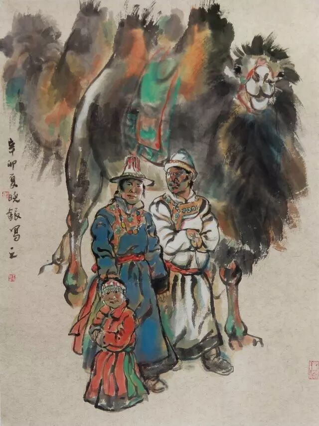 在笔墨运用上,更是近有染墨,远有留光,骆驼润以水渍,人物滋以斑斓,在具象与抽象之间游刃,在写意和抒情之间骋怀,渺茫天际境生于外。在他极为娴熟的笔法中,我们窥到了一个西北汉子最为柔情的慈悲胸怀。这种特定场景的不断再现,吸引我们去探寻河西风情的裕固族人的坚强与坚韧,心里不禁产生强烈的冲动,想要了解这块土地下的炙热情怀,以及这些情怀所透射出的伟大的艺术使命。