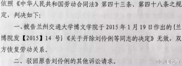2015年10月20日,榆中县人民法院作出判决(2015)榆和民初字第126号:“被告兰州交通大学博文学院于2015年1月19日作出{兰博院发【2015】14号}《关于开除刘伶利等同志的决定》无效,双方恢复劳动关系。”
