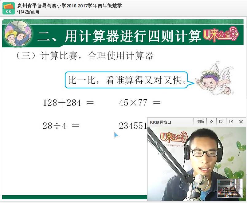 虽然弯寨小学最近的摄像头和电脑一直有些问题,但慢慢排查,总是有解决的办法的。今天金老师早点进了教室,重启了两次就顺利打开摄像头了,我们会尝试重装一下系统来解决。今天课程内容是计算器的认识和使用,有了计算器,生活中数学变的简单了呢!