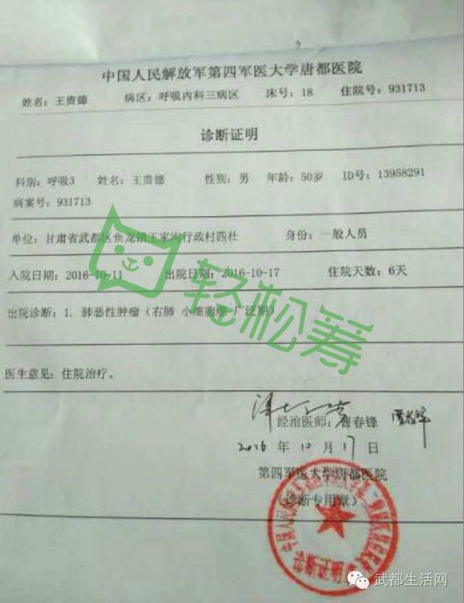 2015年8月份之前我跟大家一样也拥有幸福的家庭,健康的父母,高远的理想,每天沉浸在幸福中。可在2015年8月份中旬老天将我的幸福打入谷底,爸爸由于感冒引起持续发烧咳嗽,在陇南市第一人民医院治疗一周后病情并未好转,随后转入西安唐都医院治疗,一周后爸爸被查出患有肺癌,这个噩耗犹如晴天霹雳让全家人震耳发聩。医生建议父亲每月做一次化疗,每次费用大概15000元左右,每月15000元这对于我们一个农村家庭来说可谓天文数字,妈妈因常年生病已非家里劳动力,以前供我跟哥哥上学全靠爸爸打工挣钱,现在哥哥刚大学毕业结了婚,如今给哥哥讨个媳妇就使本来不富裕的家庭负债累累。