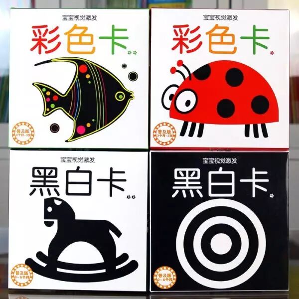 3个月大时已具有三色视觉,但这个时候他们最感兴趣的还是对比强烈的黑白两色,尤其是黑白相间的图案,所以可以备一些视觉激发黑白卡,还有一些对比强烈的图案,比如同心圆、棋盘格,还有非常简单的人面图案也很合适。