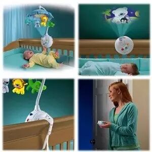 费雪床铃,大爱这个床铃,宝宝小一点的时候可以练追视,稍大点可以给他看投影,再大一点把篷子撤掉直接投影到天花板上。音乐有三种模式,有大自然的声音、世界名曲和妈妈的心跳,而且声音都很柔和。个人认为这是最好的玩具之一。