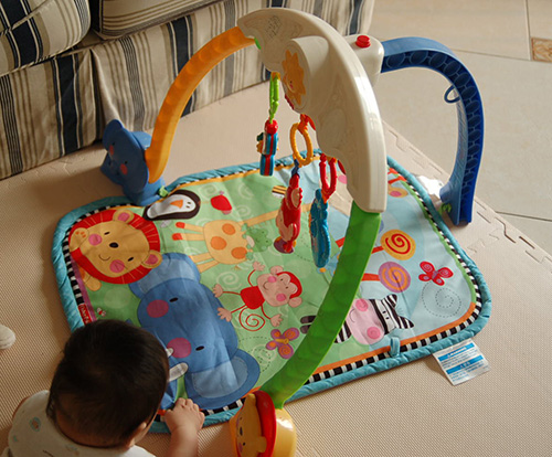 费雪健身毯,从会躺、会趴到会坐都可以玩,宝宝很喜欢,可以练习小手的抓握动作。