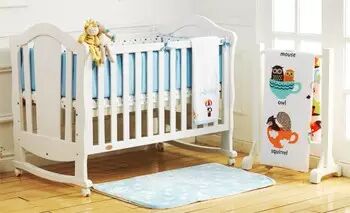 婴儿床应选择实木、环保、四周带有围栏的,以保证宝宝的睡眠安全。